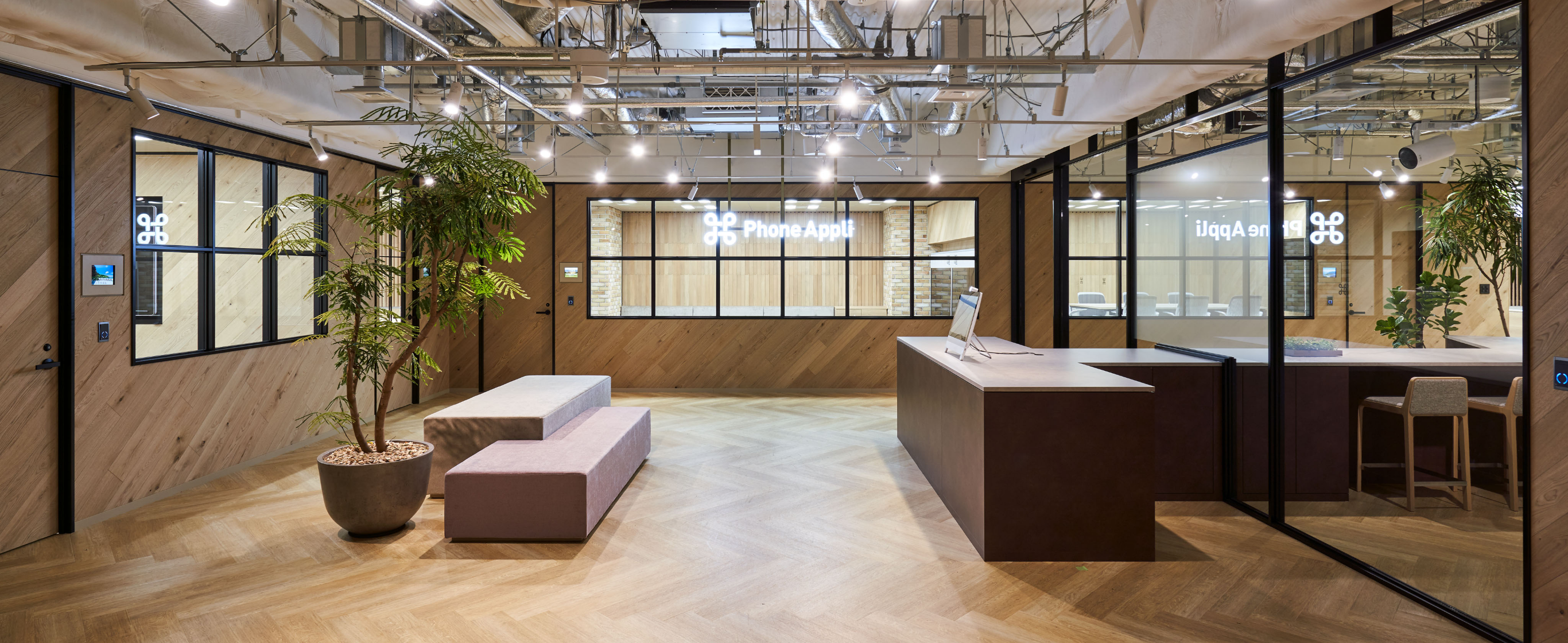 自然をイメージした温かいエントランスでお客様をお出迎えいたします。エントランスからはオフィス内のグリーンが望めます。お待ちのお客様を飽きさせません。