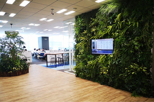 また、ビデオ会議を実施する際、カメラの画⾓に関わらず参加者の顔が重なりにくい台形レイアウトを採⽤したミーティングテーブルを設置。社員への情報共有を⽬的とし、空間的圧迫を避けるために設置したサイネージシステムも採⽤しています。
