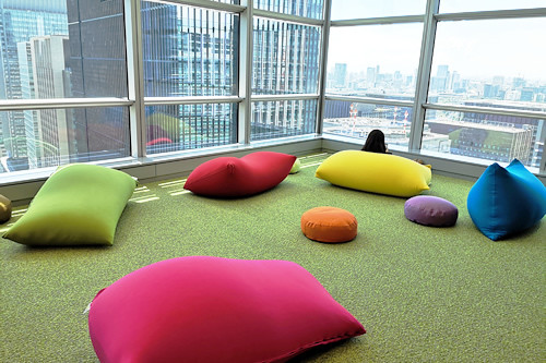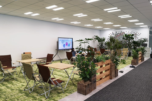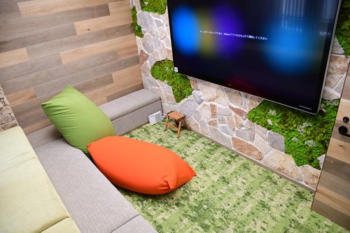 NTTコミュニケーションズから当該フロアのコンセプトとして提⽰された「⼈とのつながりを⽣み出すフィールドが整っていること」、「リラックスできて⼀番働きやすい環境が整っていること」、「⾃分が最⾼のパフォーマンスを発揮できる環境であること」という条件を⽣かしながら、靴を脱いでリラックスしながらミーティングができるエリアや、仕事の合間に少しストレッチなどもできるようなエリアのデザイン設計・構築を⾏いました。