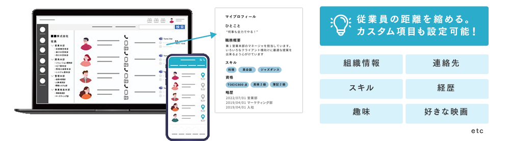 階層型組織に対応した従業員データに、スキル、経歴、趣味などから人が探せるようになります。